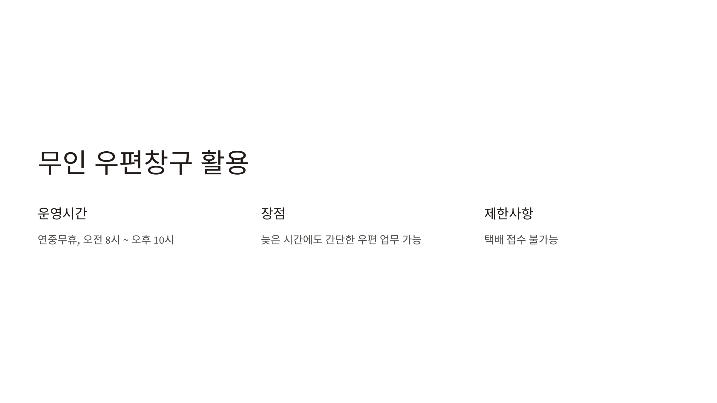 - 이용 가능한 서비스: 간단한 우편 업무 (택배 접수는 불가)